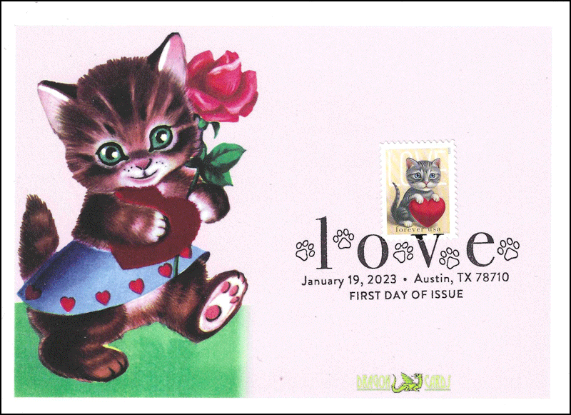 Sc. 5745 Love/Kitten on a 5"x7" Dragon Card featuring old-style Valentine art of an anthropomorphic kitten with a flower and a heart-shaped box of candy. Pictorial Postmark. Great for a love-, kittens-, cats- or pets-on-stamps collection!