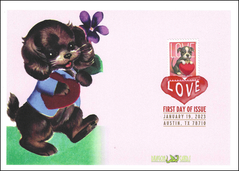 Sc. 5746 Love/Puppy on a 5"x7" Dragon Card featuring old-style Valentine art of an anthropomorphic puppy with a flower and a heart-shaped box of candy. Digital Color Postmark. Great for a love-, dogs-, puppies- or pets-on-stamps collection!