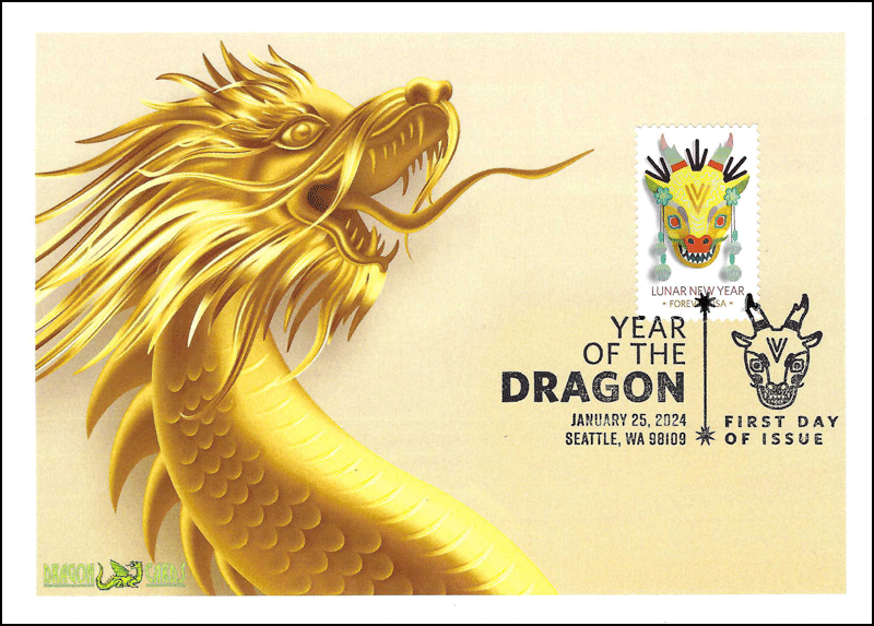 Sc. 5829 Year of the Dragon on a 5"x7" Dragon Card showing art of a golden dragon. Pictorial Postmark. Great for a Lunar New Year-, holidays-, dragons- or fantasy-on-stamps collection! Back To