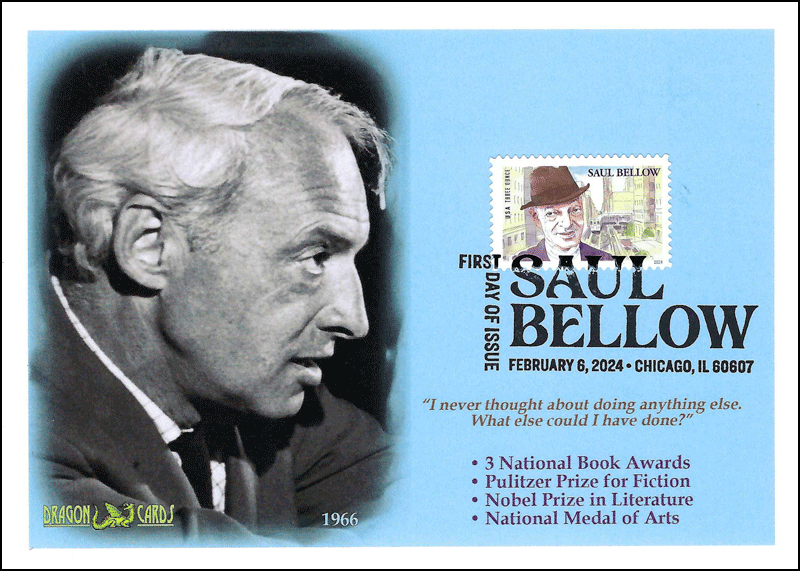 Sc. TBA Saul Bellow on a 5"x7" Dragon Card reproducing a photograph of him during a rehearsal for a play in 1966, "Under The Weather." It and two other one-act plays closed after 12 performances. Pictorial Postmark. Great for a literature- or authors-on-stamps collection!