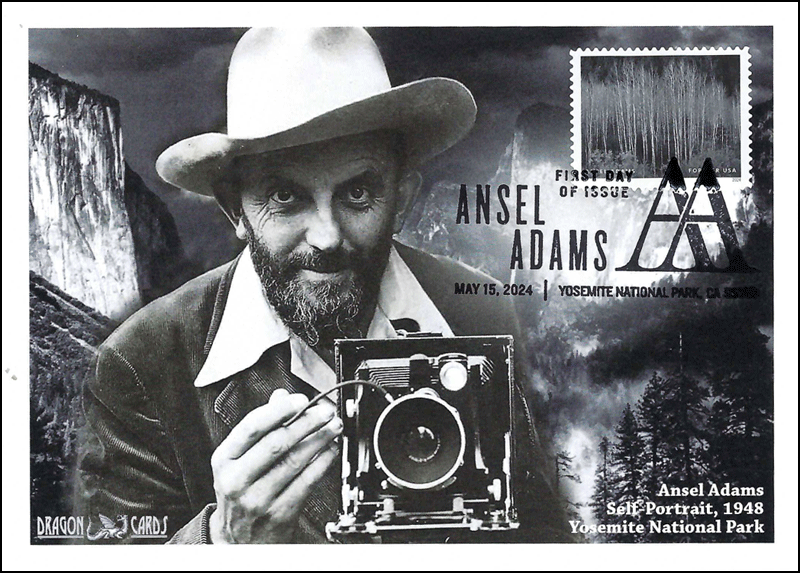 Sc. 5854n Ansel Adams on a 5"x7" Dragon Card showing his 1948 self-portrait in Yosemite National Park. A single "Aspens, Dawn, Autumn, Dolores River Canyon, Colorado" stamp is tied with the Pictorial Postmark. Great for a photography-, art- or parks-on-stamps collection!