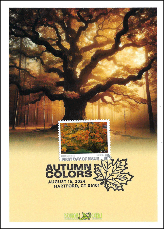 ![]() First Day Cover Autumn Colors Dgn 839b $3.00 Sc. 5933 Autumn Colors on a 5"x7" Dragon Card featuring AI-generated art of an oak tree in autumn. A single from the set of 10 (the same one on every copy of this card) is tied by the first-day Pictorial Postmark. Great for a trees-, plants- or flora-on-stamps collection! |