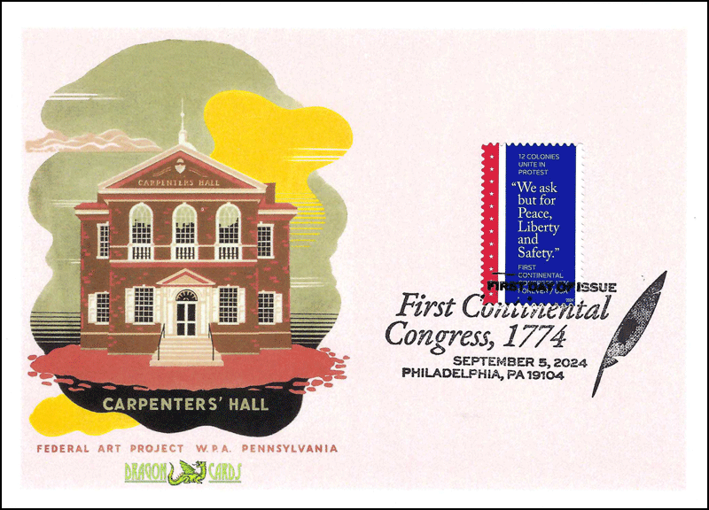 Sc. 5939 First Continental Congress on a 5"x7" Dragon Card reproducing a WPA Federal Art Project painting of Carpenters Hall, where the Congress was held. Pictorial Postmark. Great for a Americana- or Semiquincentennial-on-stamps collection!