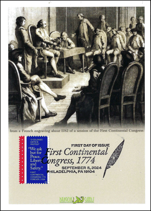 ![]() First Day Cover First Continental Congress Dgn 843a $3.00 Sc. 5939 First Continental Congress on a 5"x7" Dragon Card reproducing a 1782 French engraving of the meeting. Pictorial Postmark. Great for a Americana- or Semiquincentennial-on-stamps collection! |