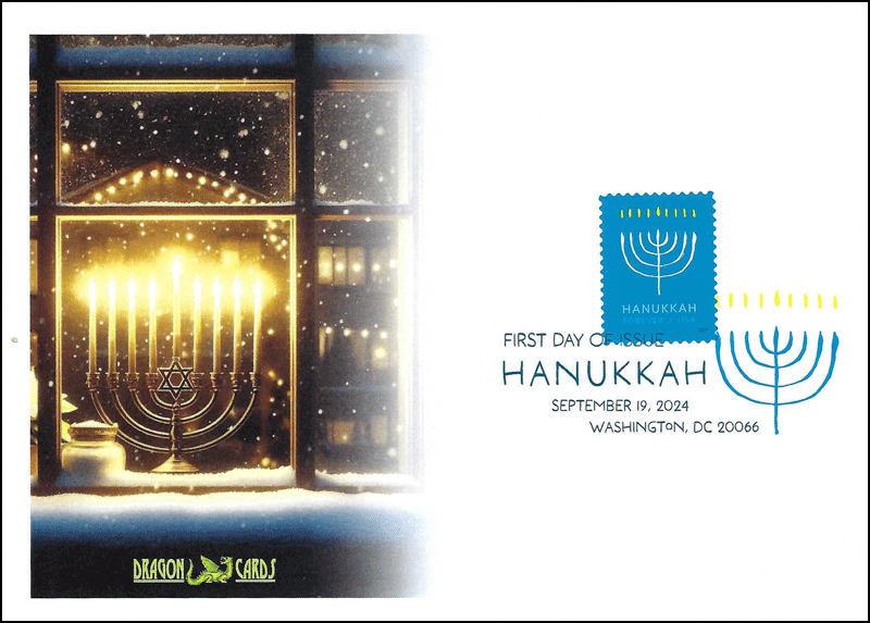 Sc. 5945 Hanukkah 5785 on a 5"x7" Dragon Card featuring AI-created artwork of a menorah in a window on a snowy night. Digital Color Postmark. Great for a Judaica-, Chanukah-, religion- or holidays-on-stamps collection! Back To