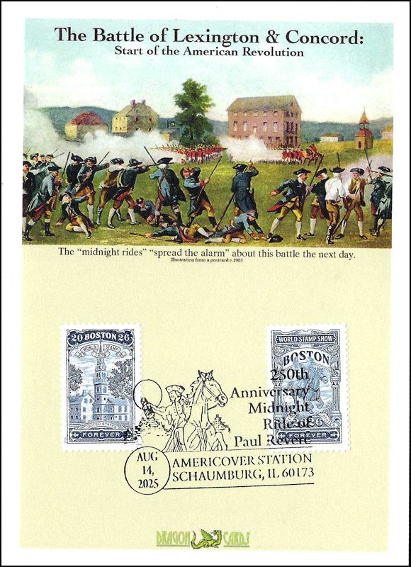 ![]() First Day Cover Boston 2026 Dgn 862a $4.00 Sc. 6029-30 Boston 2026 on a 5"x7" Dragon Card reproducing an early 1900s postcard depiction of Lexingon & Concord battle scene. The text points out that what Revere and other riders were warning about was that battle. The pair of stamps is tied by the Americover 2025 pictorial postmark for the first-day. Great for a stamp shows-, Americana- and military-on-stamps collection! |