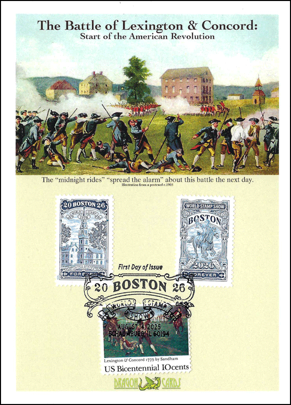 ![]() First Day Cover Boston 2026 Dgn 862c $4.50 Sc. 6029-30 Boston 2026 on a 5"x7" Dragon Card reproducing an early 1900s postcard depiction of Lexingon & Concord battle scene. The text points out that what Revere and other riders were warning about was that battle. The pair of stamps and the 1975 stamp are tied by the FDOI pictorial. Great for a stamp shows-, Americana- and military-on-stamps collection! |