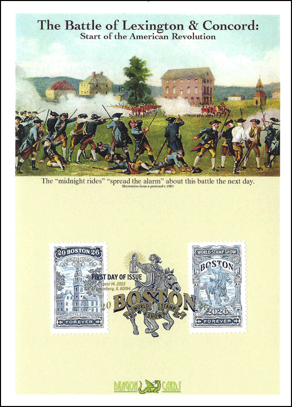 ![]() First Day Cover Boston 2026 Dgn 862f $6.00 Sc. 6029-30 Boston 2026 on a 5"x7" Dragon Card reproducing an early 1900s postcard depiction of Lexingon & Concord battle scene. The text points out that what Revere and other riders were warning about was that battle. The pair of stamps is tied by the Digital Color Postmark. Great for a stamp shows-, Americana- and military-on-stamps collection! |