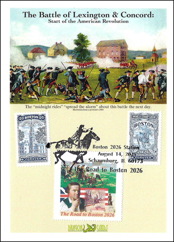![]() First Day Cover Boston 2026 Dgn 862g $4.50 Sc. 6029-30 Boston 2026 on a 5"x7" Dragon Card reproducing an early 1900s postcard depiction of Lexingon & Concord battle scene. The text points out that what Revere and other riders were warning about was that battle. The pair of stamps is tied by the Digital Color Postmark. Great for a stamp shows-, Americana- and military-on-stamps collection! |