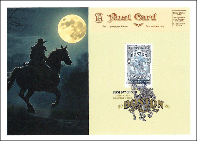 Sc. 6030 Boston 2026 on a 5"x7" Dragon Card reproducing art of a man riding a horse at night. Digital Color Postmark. Great for a stamp shows-, Americana- and military-on-stamps collection! Back To