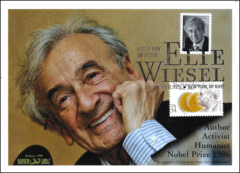 Sc. 6037 Elie Wiesel on a 5"x7" Dragon Card reproducing a photo of him in Budapest in 2009, his first trip back to Hungary since the Holocaust. The Pictorial Postmark ties the new stamp and Sc. 3504 Nobel Prize. Great for a Judaica- or authors-on-stamps collection!