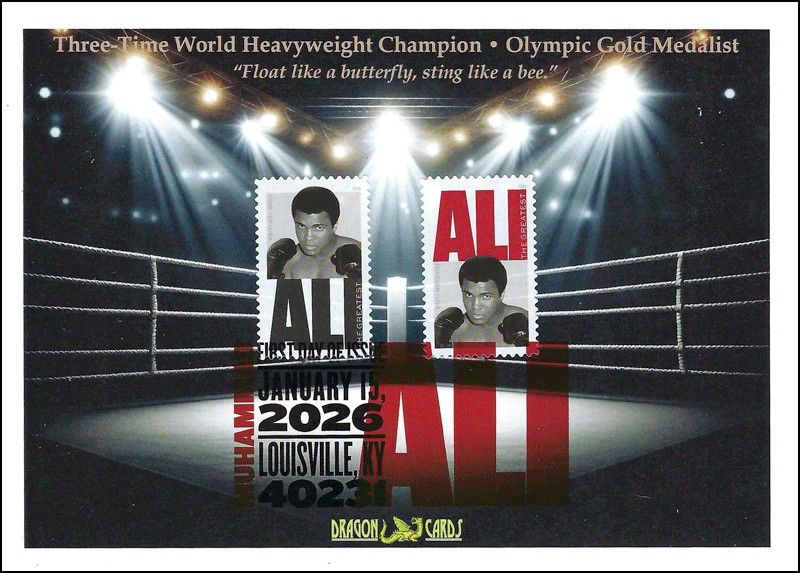 Sc. TBA Muhammad Ali on a 5"x7" Dragon Card showing a boxing ring lit by spotlights. Above it is text "Three-Time World Heavyweight Champion • Olympic Gold Medalist" and the quotation "Float like a butterfly, sting like a bee." Digital Color Postmark. Great for a sports-, boxing- or black history-on-stamps collection!