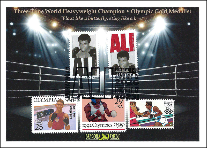 Sc. TBA Muhammad Ali on a 5"x7" Dragon Card showing a boxing ring lit by spotlights. Above it is text "Three-Time World Heavyweight Champion • Olympic Gold Medalist" and the quotation "Float like a butterfly, sting like a bee." The pictorial postmark ties the two new stamps plus Sc. 2051 Olympic Boxing, Sc. 2640 Olympic Boxing and Sc. 2499 Eddie Egan, one of whose gold medals was for boxingk. Great for a sports-, boxing- or black history-on-stamps collection!