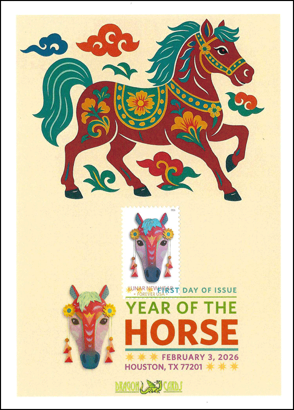 ![]() First Day Cover Year of the Horse Dgn 872 $4.00 Sc. 6054 Year of the Horse on a 5"x7" Dragon Card showing a Chinese-style prancing horse. The artwork was created by Dragon Cards using artificial intelligence. Digital Color Postmark. Great for a horses-, animals- or Lunar Holidays-on-stamps collection! |
