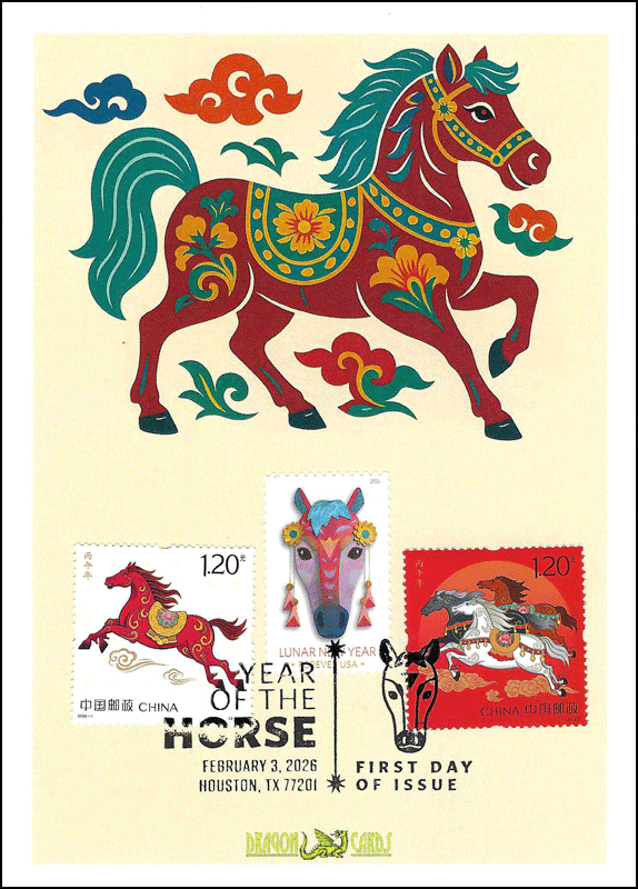 ![]() First Day Cover Year of the Horse Dgn 872c $6.00 Sc. 6054 Year of the Horse on a 5"x7" Dragon Card showing a Chinese-style prancing horse. The artwork was created by Dragon Cards using artificial intelligence. The Pictorial Postmark ties the new stamp and the People's Republic of China's two 2026 stamps. Great for a horses-, animals- or Lunar Holidays-on-stamps collection! |