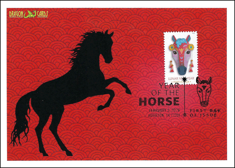 Sc. 6054 Year of the Horse on a 5"x7" Dragon Card showing the silhouette of a rearing horse on a Chinese-style red background. The design was modified using artificial intelligence. Pictorial Postmark. Great for a horses-, animals- or Lunar Holidays-on-stamps collection!