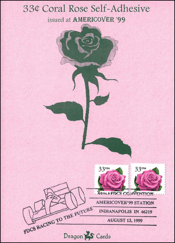 ![]() First Day Cover 33¢ Coral Pink Rose booklet Dgn 87d $3.00 Sc. 3052-3 33¢ Coral Pink Rose booklet on a black on coral pink 5"x7" card, picture of rose, with Americover 99 show cancel (first day); single, perfed 3 sides. Both varieties (Sc. 3051 and 3052). Great for a roses- or flowers-on-stamps collection! |