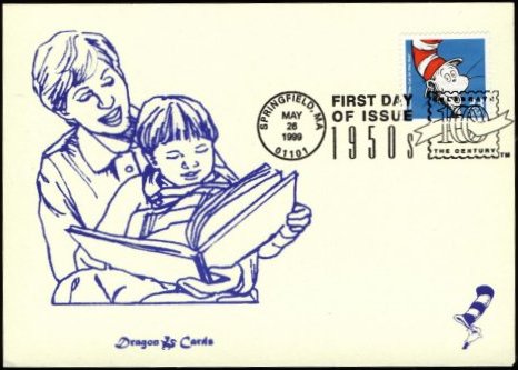 Dgn 85d: Sc. 3187h Dr Seuss — single from the 1950s Celebrate the Century sheet on a blue-on-cream 5"x7" Dragon Card, drawing of mother reading to child from large-format book, with a tip of the Hat to the rights agency that would not cooperate in the lower right corner. CTC Cat In The Hat Stamp in the upper right with the pictorial First Day of Issue hand cancel; 2004's Dr. Seuss stamp and its circular date stamp added — larger illustration (new window)...$4.00