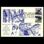 Dgn 83: Sc. 3187c-j Century: NYC Baseball — Blue on cream 5"x7" card, horizontal, details from 1950s NYC subway map, pitcher winding up, short text on front; longer text on back explains dominance of NYC teams in 1950s; both stamps...