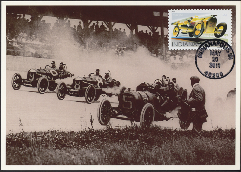 Sc. 4530 Indianapolis 500 on a Indianapolis Motor Speedway postcard showing the first race in 1911. Small circular date stamp. Great for an auto racing- or cars-on-stamps collection! Back To